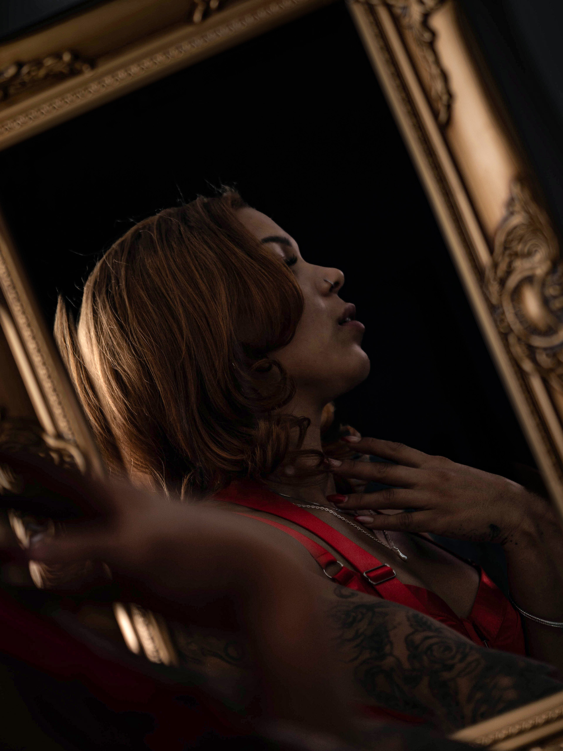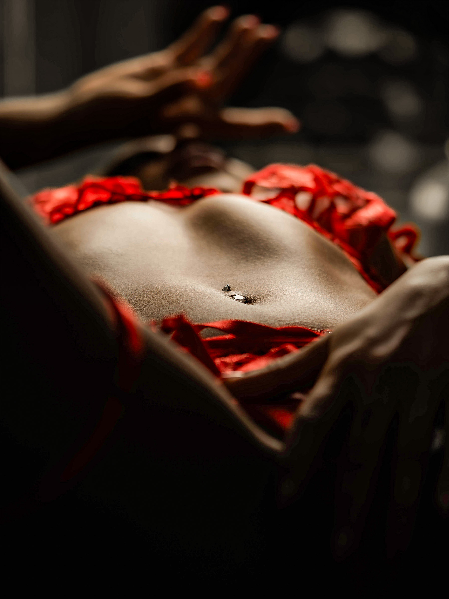 Die intensive rote Farbe der Dessous erzeugen einen aufregenden Kontrast, der dem Bild eine zusätzliche Tiefe und Intensität verleiht.